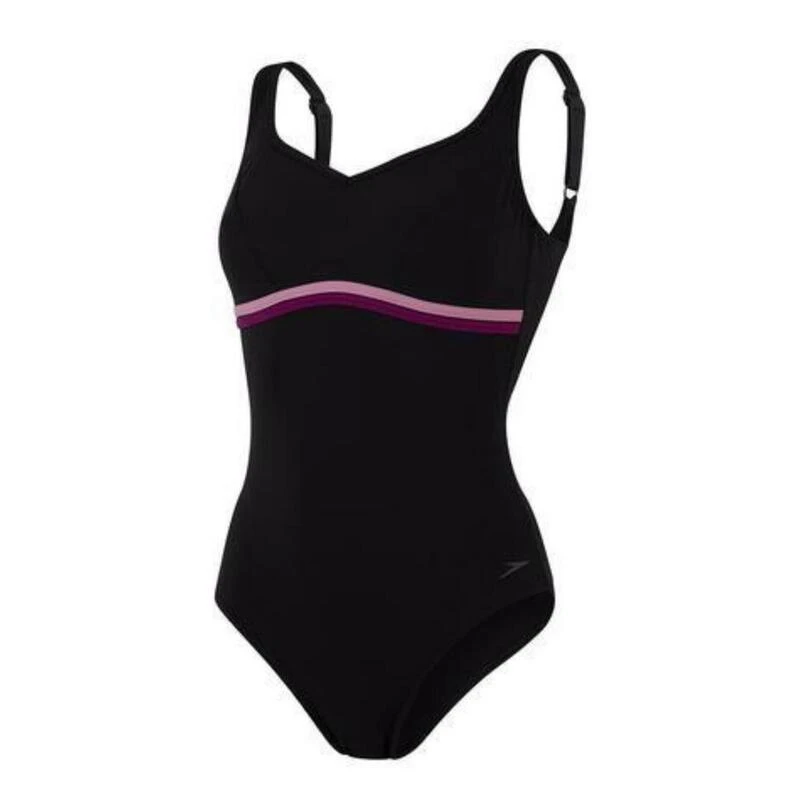 Geef uw zwemkleding een sportief tintje zonder afbreuk te doen aan uw vrouwelijke figuur. Dit tijdloze zwarte zwempak heeft heldere witte en blauwe biezen onder de borst voor een subtiel vleugje kleur om uw vorm te verbeteren. De verstelbare bandjes en de naad onder de borstkas zorgen voor comfort en ondersteuning tijdens het zwemmen. Ons ShapeComprex Ultra shaping-materiaal maakt uw figuur slanker en de XtraLife lycra gaat twee keer zo lang mee als standaard zwemkledingstoffen. Ze zijn perfect voor regelmatige sessies.
