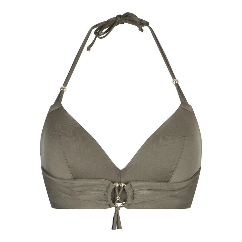 Khaki & Royal Blue… Afgewerkt met haar gouden details zorgt deze serie voor een vrouwelijke, klassieke en trendy look. Met deze serie blijf je niet onopgemerkt deze zomer! De triangle bikini top is een voorgevormde top met beugel. De bikini sluit doormiddel van een rugsluiting met clip en een striksluiting in de nek.