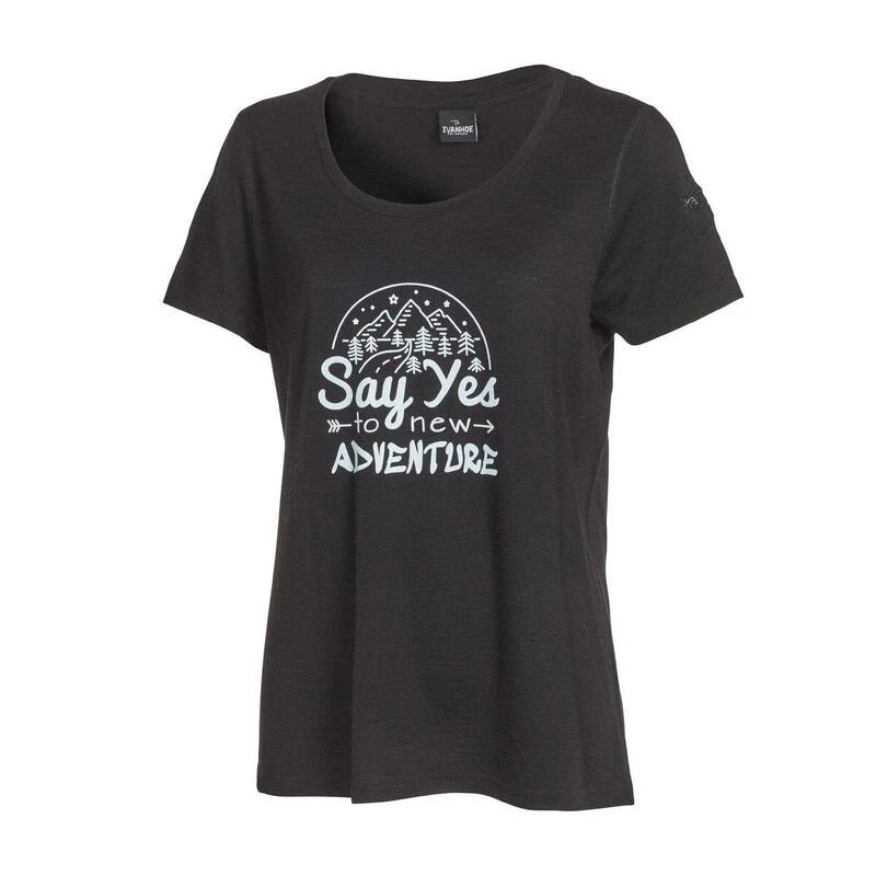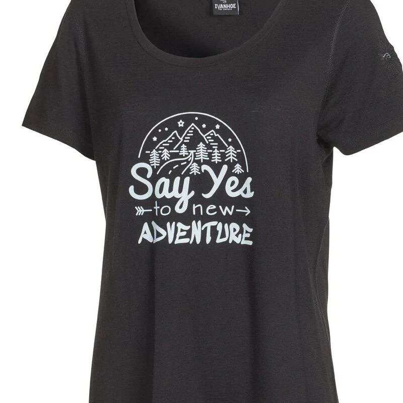 De Ivanhoe t-shirt Meja Adventure voor dames van 100% merino wol is een korte mouwen shirt gemaakt van 100% extra fijne merinowol. Met een leuke expressieve print voor nieuw avontuur.